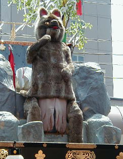 | わー、これぞ「こうがんふくらませたぬき」。けっこう獣風の趣がある狸です。目玉は純金を使っているとか。 | リアルなお毛毛付のこうがんです。これが右に左にゆらゆらと。 | 山車の中では5人ほどの方がこのからくりを演じています。(暑いなか、ご苦労様です。)やがてこうがんが萎み、またうずめのみことに変身してからくりが終わります。 |