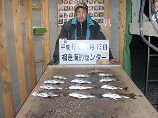 | 2003年度の初チヌを求め、相差へ初釣行。前回は白石湖で惨敗やったけど・・・相差なら何とかなりそう・・・(^^ゞ 最近の相差は正月明けには筏で年無しが釣れとったし、沖カセでも小さいけどポツポツ釣れて状況。1/11には、たろ(TARO)さんらが、沖カセで30cm前後を13枚釣っとったし、今年の相差も好調のようやな。前日、ヒデさんから電話がかかってきた。うちと同じ日に何処かへ釣りに行こうとしとるようで、相差の様子も気になるみたいや・・・他にも候補はあったようで、結局今回は別々になった。明日も天気もエエし日中は暖かいやろな・・・絶好に釣り日和になりそうや。 いつもの様に前夜のうちに自宅を出発し久居釣具へ向かう。ボケを予約してへんだら、何とボケが品切れ。(-_-) しゃーないな・・・とりあえず他の餌だけ買って、相差へ向かう途中でボケ仕入れたらエエか。そうそう、久居釣具は春に店舗新規オープンするんで、今までの店舗の所はもっか建設真っ最中で、仮店舗は昔の店舗の向かいで今までと変わりなく営業してます。国道からは少し見え難いけど、国道から左に入れば左側にあるんで判るはずです。新規オープン時に屋号も今までの【久居釣具】から【釣り餌のイワキ】に変わります。オープンは3月中旬頃とのこと。店立派になってもエサ値上げせんといてねぇ・・・とお願いしておきました。(^^ゞ で、相差には0時半に着。まだ誰も居らん。荷物だけ船に積み込んで、サッサと車中泊。(-_-)zzz 5時半に起床。外へでるとやっぱ朝はメチャ寒い。常連の深津さんが来とる、桟橋で何しとるんかと思ったら早々に団子の準備や・・・・ん、既に3杯も作ってあるやん!(・o・) うちも1杯位は作ることあるけど・・・ハハ凄いな。(^◇^;) 他にはあと一人来てるだけや、今日は3人だけ?! 渡船時間までの間、沖アミとアミエビを海水で溶かしておく。あと七輪にも火を入れて・・・と。準備は万端。(^^ゞ 大将も起きてきた。「今年もお願いしますぅ・・」とご挨拶。大将と喋っとったんやけど、最近はお客が少ないって嘆いとった・・・寒いでなぁ・・・乗っ込み期には放っといても来るやろけど。皆、冬の相差の美味しさを知らんのかなぁ・・・よー釣れるのに。(^_^) |
