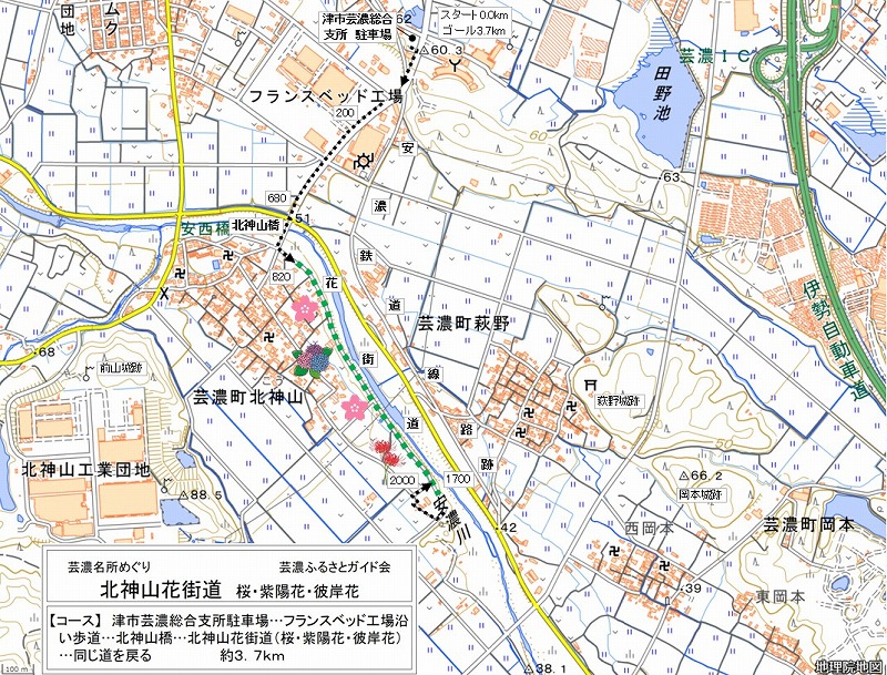 三つ子山と桜 桜並木と安濃川の間に歩道があります。 |