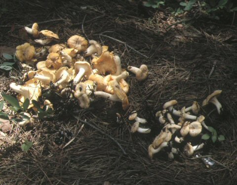 ぽつんと生えることもあれば、群生することもあります。腐生菌と思われ発生場所を特定することは難しい種類です。本種は虫があまりつかず、かすかに果物のアンズの香り(といっても最近ではアンズの方が珍しいくらいで説明に苦しむ)がします。優秀な食菌です。