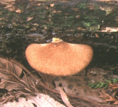 傘の表面に栗色の毛をまとったきのこです。広葉樹の腐朽木に生えます。