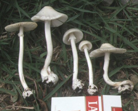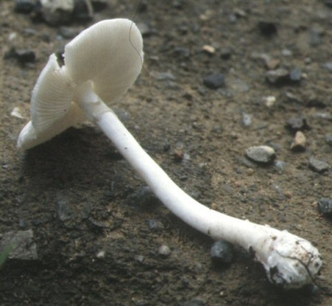白い色、大きなつぼ上方につくつば、乾くと発生してくる魚の腐ったような悪臭などたいへん同定しやすい種類なのですが、夏の終わりから発生しいわゆるきのこシーズンに出会うことは少ないです。死にも至る猛毒きのこです。