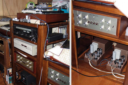 メインアンプはラック下から二段目の右二台、マランツ#5モノラル二台。