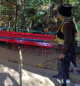 隠の自称トップアーチャーさんは、津レンジの赤いベンチで顔色を赤く変えてナニやら地べたをゴソゴソといじっていました。