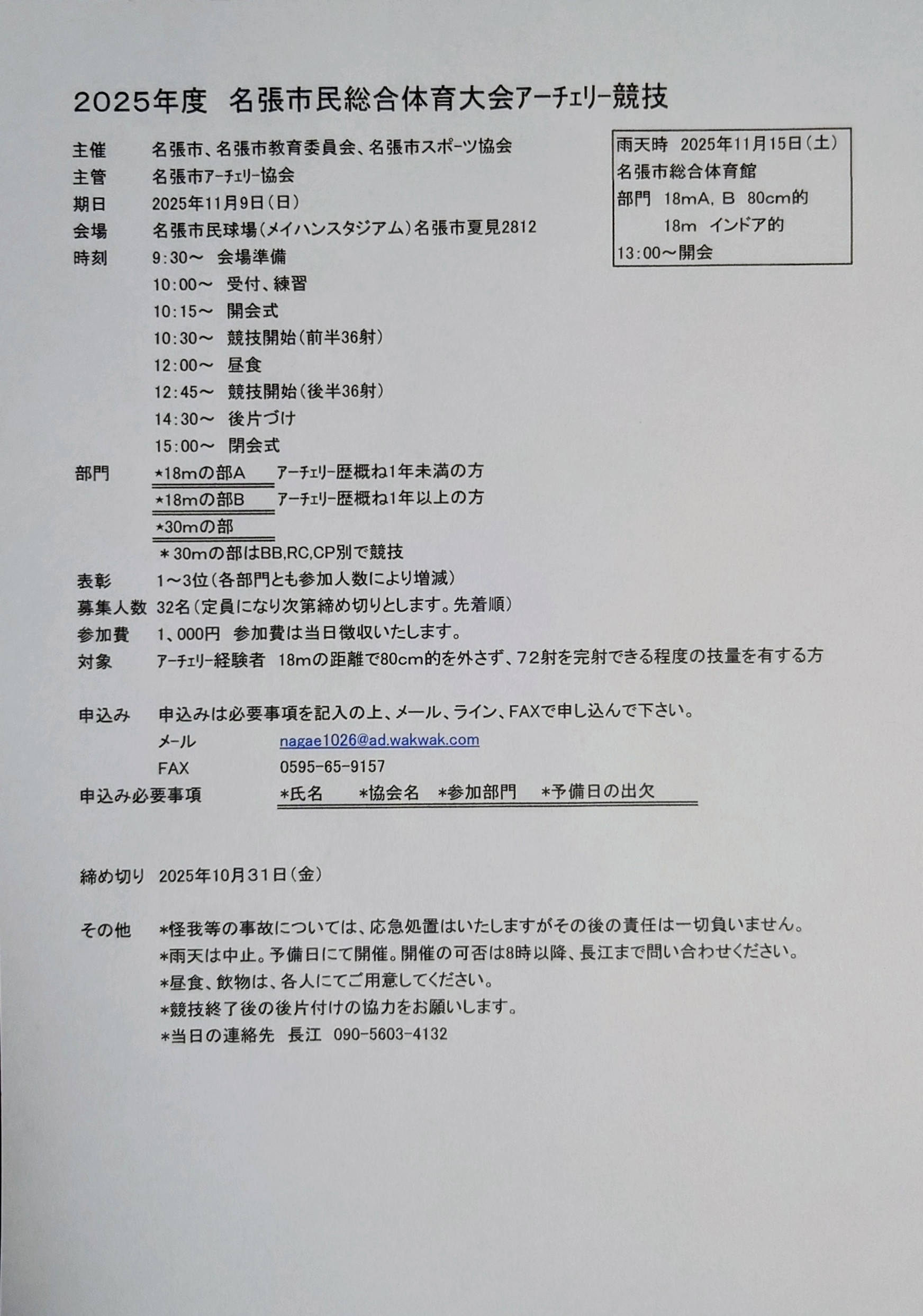 参加資格:一般部門=三重県アーチェリー協会の加盟団体登録者で30mから80cm的を外さない程度の技量の方