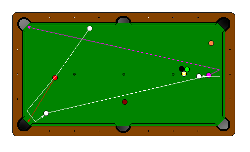 @→Aのネキは気持ち左をヒネって少しでも厚く出るように撞いたつもりだったのですが、やはりイレを大事にいってしまいAが薄くなってしまいました。Bはどちらのコーナーにとっても良かったんですが、Aが入る力加減で撞くと自然に上側に出るんでそちら側に出すことにしました。クッションタッチさえしなければ良いかな〜?と思ってたら・・・ぐぁ。クッションにかなり近く撞きづらくなってしまいました。<図3>