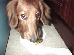 きょうは、【美容院】でカットをしてもらいました。トリマーのお兄さんは 「今日は、手を囓ら→れました」って。 だって、つめきり大嫌いなんだもの。 疲れきって帰ってきたところを、写真にとられたの。 |