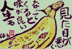 | バナナ 絵筆をとるとそこには、腐る1歩手前のバナナがあった。じっと見つめていると、こんなことが頭をよぎるのです。 店屋のバナナは、今すぐ食べるにはちょっとまだ早い。なぜか家においておくと、あっという間に賞味期限が切れる。人間も同じ、あっという間に賞味期限切れ。そのちょっと前が一番おいしいみたい。 |