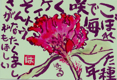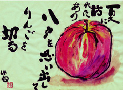 りんご (ハガキではなく、和紙に描いたものをスキャナーで小さくして取り込んだもの) 今年の夏、青森へ家族旅行に出かけた。子供の成長とともに、家族で旅行をするなんて、そうそうできなくなるなあと、ちょっと寂しい気もする。楽しかった夏の思い出を、娘達は、ずっと心の引き出しにしまっておいてくれるだろうか? |