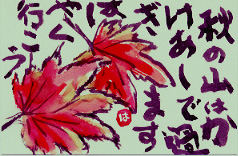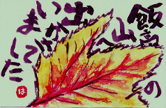 | 落ち葉 山歩きをしていて拾った落ち葉の一枚。 やっとの思いで持ち帰った落ち葉。それだけ大変な山歩きだったのだが、帰ってくるとその大変な思いは忘れてしまっている自分がいる。舌の根も乾かぬうちに、次に行く山を探してしまっている。実家の母に送ろうと思って描いた一枚。 |