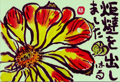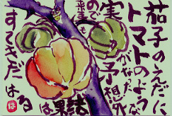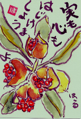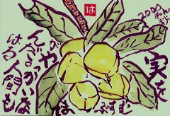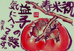 | かき 今年は柿がたくさん実をつけた。本当においしそうな色をしていたので思わず描いてみた。親戚のおばあちゃんが、今年米寿のお祝いをしたとかで、息子さん夫婦から記念の品に『益子焼きの菓子鉢』をいただいたお礼のハガキです。 |