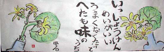 花(つわぶき) 庭のつくばいの側に斑入りの『つわぶき』が咲いていた。この葉っぱには、黄色い花が咲くと思ってはいたが、いつ頃咲くのか気にもとめなかったが、絵を描くようになって、あらためて花の時期に気を止めるようになった。晩秋から冬にかけて咲いているとは。あまりにも鮮やかな黄色だったので 一輪差しにさしてみたもの。 |