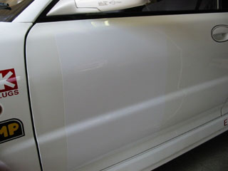 | C.そしてリタックシートを剥がしたところです。前後ドアにまたがる部分は貼り終ってからデザインナイフでカットし、それぞれの折り返し処理を行います。 | D.外は吹雪いてます。でも、シャッター付きガレージなら安心して作業が続けられます。 |
