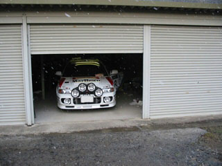| A.以前の仕様から引き継ぐステッカーを除き全て剥がします。丸3日かかりました。剥がした部分にステッカーの糊が残ってしまいましたが、ブレーキクリーナーで強制撤去です。 | B.レプリカ車両の貼り作業は全てこのガレージ内で行われます。シャッター付きガレージなので雨風はしのげます。 |