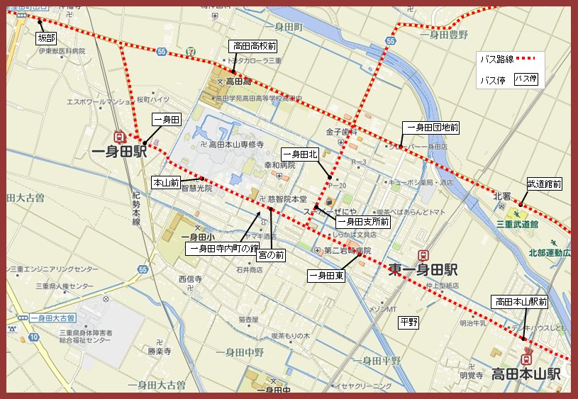 【一身田寺内町への交通機関】 赤点線は三重交通バス、名称はバス停名。