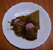 Cこしあん約30gを丸め、蒸しあがった道明寺粉の皮(約30g)で包む。