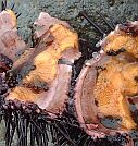 早速、ムラサキウニを割って賞味です。う〜ん、甘い! |