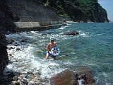 活二さんとはこの日の昼に待ち合わせなので、それまで明日の予行演習とばかり、糸魚川から少し北に走ったところで潜って、海の幸を収穫することになりました。といっても私は潜れないので、一風さん、mac3さん、お助手さん、テイ−ピ−(あんたまで潜るのか)が海に潜って獲物探しです。 |
