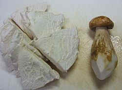 先ずは、比較対象のヤマドリタケモドキです。 一口食べて、美味い!この旨みと甘みと味の濃さ、歯ごたえとどれをとっても一級品です。私がひとかけら食べる子供が食べ始め・・・・美味い美味いを連発しながらあれよあれよという間に無くなってしまいました。 |
