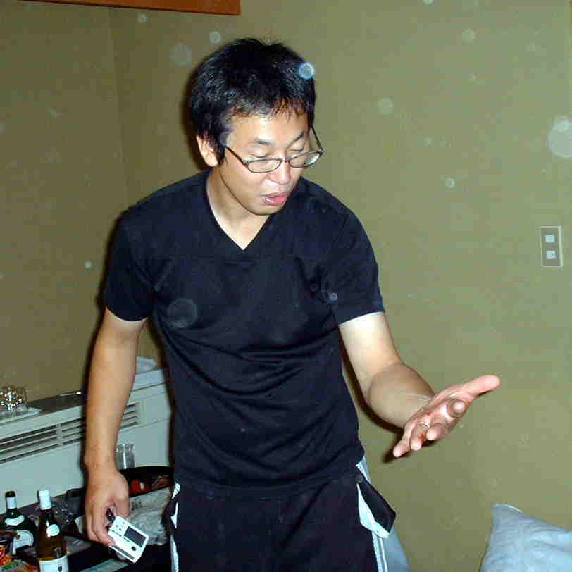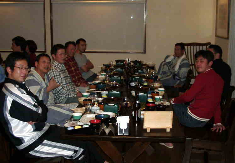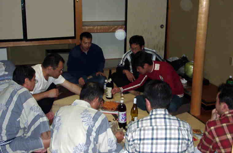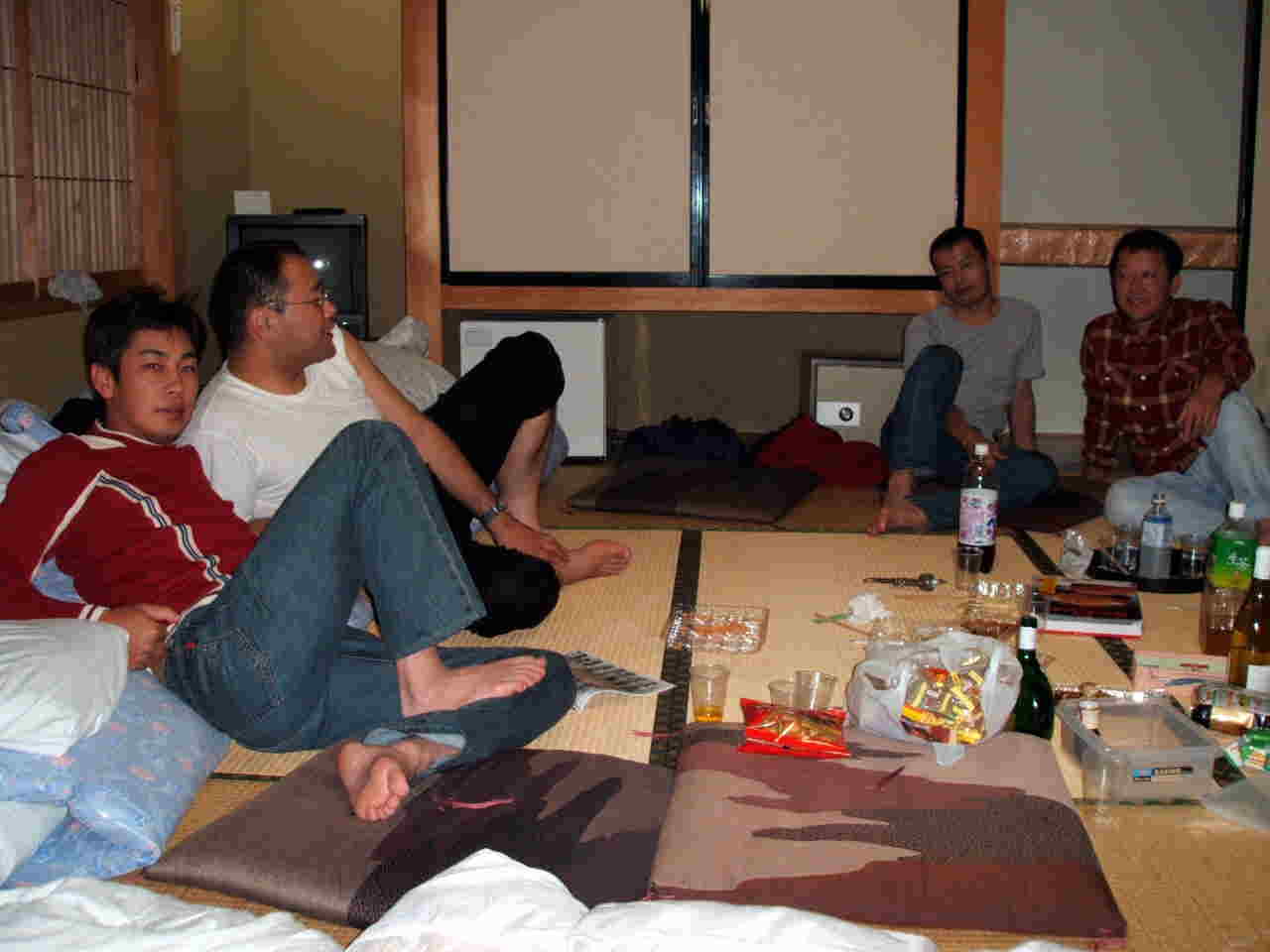 | 夕食の後は、いつものようにエンドレスでのダベリです。 今回も各自持参したアルコールやおつまみ類が振る舞われ、大いに盛り上がりましたが、翌日に中津川市で開催される旧車イベントにエントリーしているぱらら〜んさんは、明日は早朝から出発するとのことで早々とお休みに。 私は私で、疲れからか日付変更を待たず睡魔に負けて爆眠。 したがって、ナニがあったのか詳しい事は判りませんが、酒に酔った1名が文字通りの「階段落ち」をやらかして左手の平を切って流血沙汰に(ヲイ) バンドエイドで応急治療したみたいですが、イモ焼酎は程々にしておいた方が良いと思うぞ。(今年は焼酎仲間が見つかって良かったね) なんだかんだで、午前2時頃までやっていたみたいです(不確定) |