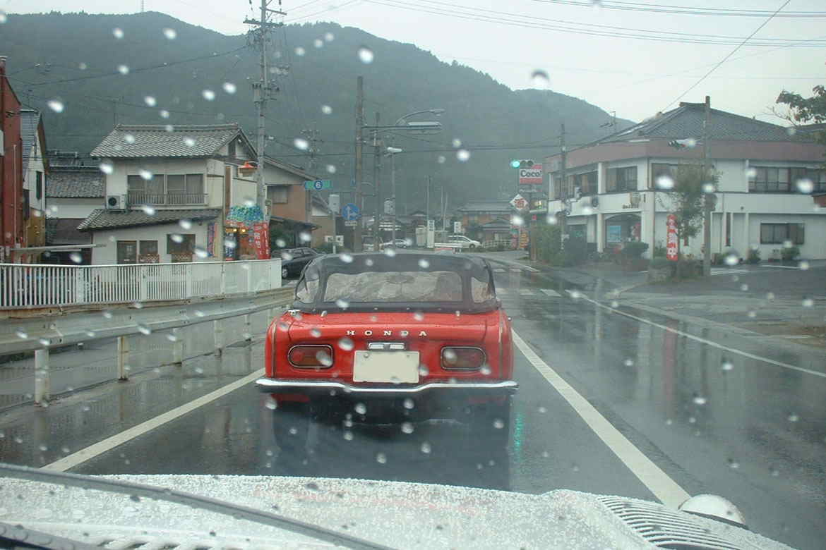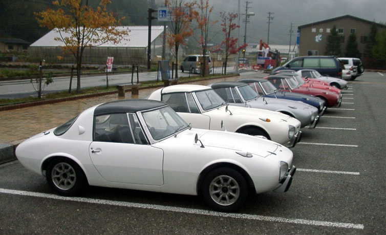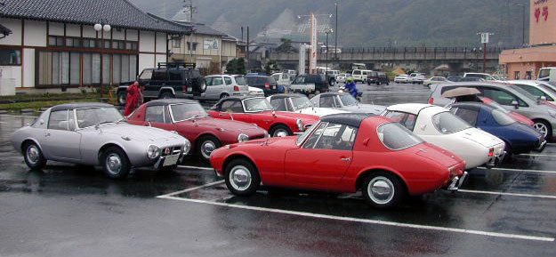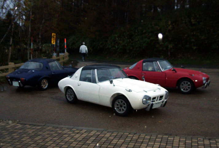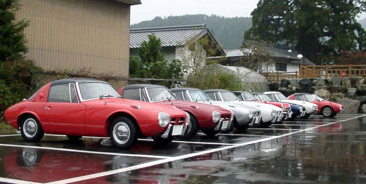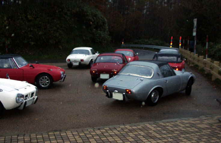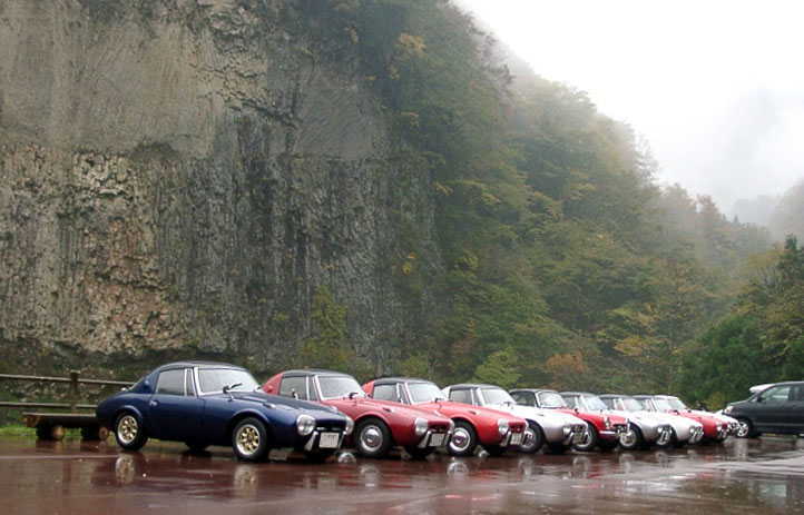 さて、齢40年に達しようかとしているロートル・スポーツカーの1泊2日ツーリングにとって雨天スタートというのはかなり辛い。 しかも、今回は風光明媚でありながらも、あんまりメジャーじゃない観光地巡り&秋の紅葉を堪能するという微妙なコンセプトでコース設定をしているので、雨天である時点で、その殆どがぶち壊しである。 とにもかくにも、出発地点の道の駅「きりら坂下」に到着した時点で、既に雨は本降りに近い状況となっていた。 にも関わらず、全員が旧いスポーツカーをドライブして参加しているという覚悟完了状態。 中には幌しかないホンダS8までいるのであるからたいしたものである。 |