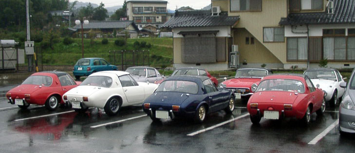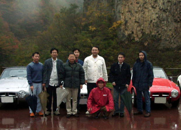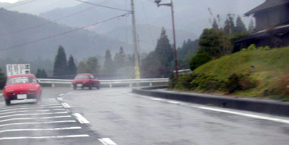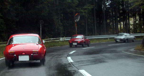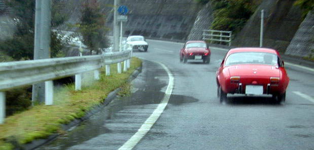 しかし、いつものことながら、雨が降ろうが槍が降ろうがそこに山道がある限り、有り余る45馬力(1台だけ68馬力)を駆使して全力でヒルクライムしてしまう参加者達・・・・ 9月の上天気に現行カローラで偵察に行った時よりルート走行時間が早いってのは、どういう了見ですか?皆さん。 ぴっぱり屋さんなんか、この悪天候に古いバイアスタイアつけて滑りまくっていながらこのペースだし(汗) 走りながらも密かにビデオ撮ったり写真撮ったりしてる剛胆な人もいるし・・・ 我々のツーリングコースは基本的にヨタハチのようなライトウェイトスポーツカーが目一杯楽しめるようなコース設定をしているんだから調子良く走れるのは判りますが、それにしても雨天走行までは配慮していなかったからなにかあったら大変です。 私は、このコースを走行するだけで、殆どのエネルギーを使い果たしてしまいました。(精神的にも肉体的にも) |