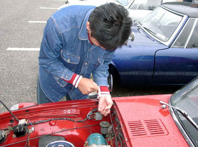 | どうにか、小休止場所の「大平展望台」に到着した頃には、雨天という事もありライトを点灯しないととても走れない状況。 休憩もそこそこに、最後のヒルクライムに挑戦です。 残りの10数キロを走破して、どうにか目的地の濁河温泉のゲートをくぐった時には、すでに周りは暗くなっている始末。 しかも、標高1800mという高地なのでキャブもアップアップでエンジンに力がない! ホテルまでの最後の坂道を登る時には2ndでもきついという体たらくです。 アイドリングは落ちるだろうと予想してアイドルアップはしてきましたが、これほどエンジンパワーがダウンしてしまうとは予想外でした。 はるか高空を飛来する過給器をつけた大型の爆撃機を迎え撃つために、非力な自然吸気空冷星形エンジンの戦闘機にのる帝国陸軍航空兵の気持ちがホンのちょっとだけ判ったような気がします。 相変わらずな雨降りの中、どうにか愛車を駐車スペースに止めて雨天対策です(泣) 用意の良い参加者の中には専用のボディーカバーを持参している人もいましたが、男らしくそのままで濡れるに任せる人。女々しく雨水侵入部にビニールテープで目張りする人。適当に裁断した厚手のビニールでキャビン部分だけほっかむりさせる人。と雨対策(雨漏り対策)はそれぞれでしたが、皆さん、濡れ鼠になりながらの作業、ご苦労様でした〜 |
