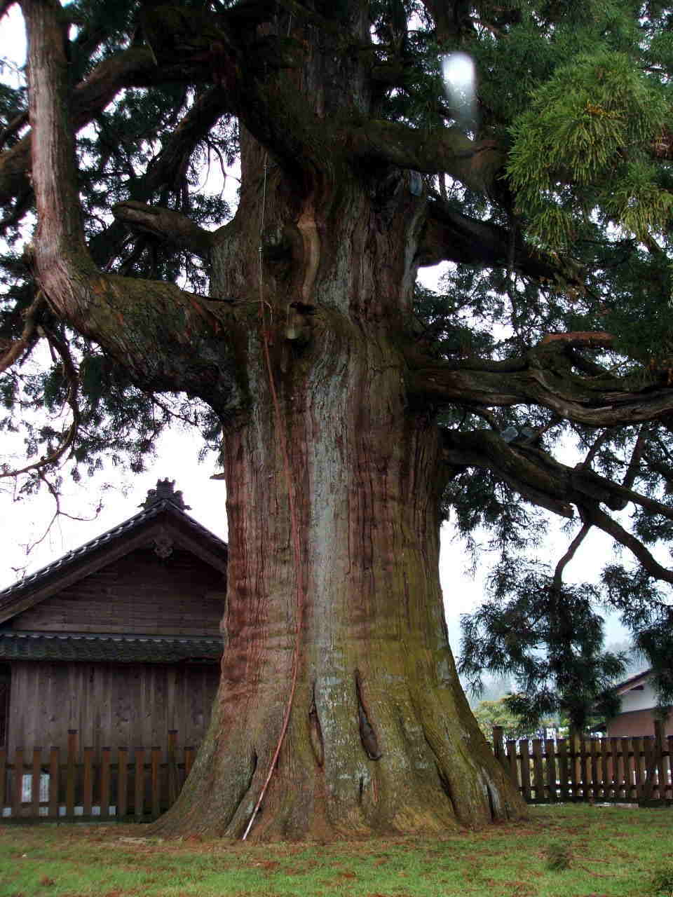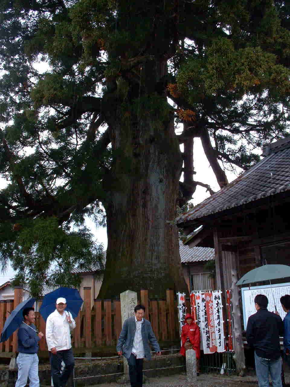 最初の目的地はwata8さんご希望の巨木ツアー、「かしも大杉」である。 ところが先導車(私)が雨天走行で進入路を見失って通り過ぎてしまい、いきなりのUターン・・・(汗) ご迷惑をお掛けしました(平謝り) さて、この大杉、樹齢が1千数百年とも言われている老木で、間近で見るとその巨大さに圧倒されます。 近くには立派な駐車場もあり、生憎の天候もあって貸し切り状態・・・ 喜んで良いのやら悲しんで良いのやら。 |
