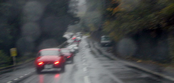 巌立峡を離れた一行は、いよいよ本日の目的地である濁河温泉に向かって県道441号をヒルクライムです。 天気が良ければオープンにして木々の紅葉と絶景の峡谷を堪能しながらのヒルクライムになるはずだったのですが、締め切った窓から見える景色は必死に動くワイパーと大粒の雨、そして霧に閉ざされた道路のみ(大泣) |