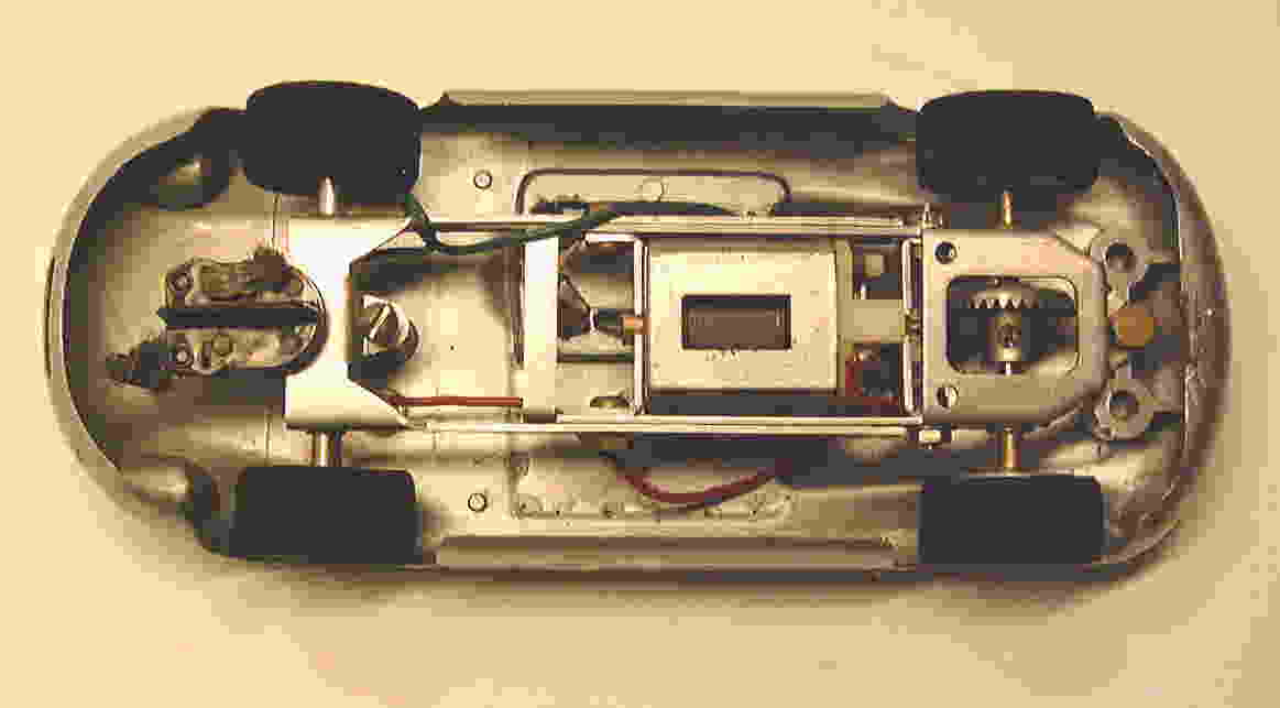 | 向かって、左がシャシ,右側がボディである。 大抵は、この様に簡単に分解出来るように作られています。 勿論、メンテのためにであるが、もう一つの理由としてはボディを交換して遊ぶ為でもある。 当然、激しいレースによってボディにダメージが及んだ末に交換。なんて事も日常茶飯事だから、この辺りの作業は簡単でなければ困ってしまうのであるが・・・ さて、シャシは大抵の場合、アルミか真鍮のプレス加工品で単純な梯子型構造で、その後部に動力源であるモーターが取り付けられていますが、殆どの場合は縦に積まれています。 但し、タミヤ等の一部のモデルやCOX製などには、モーターを横積みした物もありますが、これらはサイド・ワインダー・シャシと呼ばれて区別されています。 モーターはナイロン製もしくは金属製のギアの組み合わせによって後輪車軸に動力が伝えられるのですが、ここのギア比の選択によりパワー重視,最高速重視等の、まるでミニ四駆と同じ世界が展開されます。 もしかしたらミニ四駆の元祖はスロットカーなのかもしれません。 動力は、シャシの前方に取り付けられたガイド・ブラシ(写真上方の黒い部品)によって、コースのスロット左右の電極より供給されますが、このブラシのシャシへの取付構造も、各メーカーが趣向を凝らしていて、大変興味深いです。 ガイド・ブラシは、スロット・サーキットに刻まれた溝にはめ込まれる事によって、モーターに電力を供給すると共に、走行における文字通りのガイドとなる機能を有しており、このガイド・ブラシの存在こそがスロットカーのスロットカーたる所以となっています。 タイヤ及び車軸に関しては、現在、入手出来るシャシでは、タイヤは車軸と共にシャシに開けられた穴に真鍮製の軸受けを用いて取り付けられ、トレッド調整は同じく真鍮製のカラーによって調整する物が多く、 このためにホイールはアルミ製で軸を固定する芋ネジが取り付けられており、多少のトレッド調整が可能になっています。 但し、当時のシャシ(1960年代のオリジナル,ここではビンテージ・スロットカーと呼びます。)では車軸にネジが切ってあり、そこに同じくネジ切り加工されたホイール(大抵はアルミ製の挽物)とナットを使ってダブル・ナットで締め付けて固定しており、トレッド調整に関しては余り自由度が高くなかった物が多かったです。 |