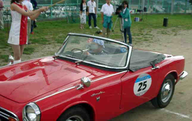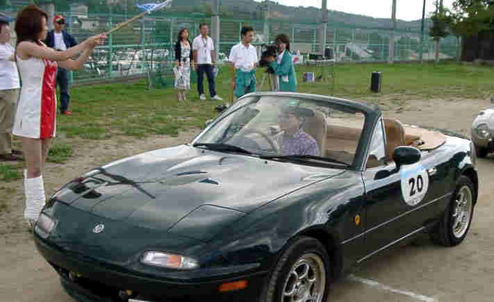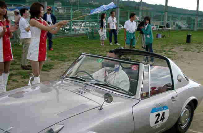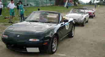| チェッカーフラッグを受けながら出陣する仲間達。 上から 元師匠さんのユーノス・ロードスター 御大さんのホンダS800 えびせんぱぱさんのトヨタスポーツ800 |