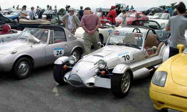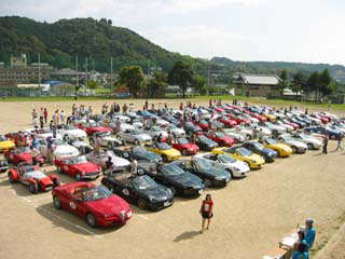 | こちらは主催者側の駐車スペース。 三重オープンカーサークルのお歴々の愛車たちです。 黄色のエランが会長さんの所有するクルマ。 |