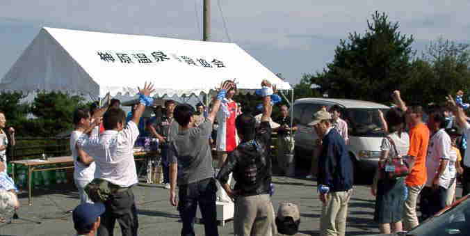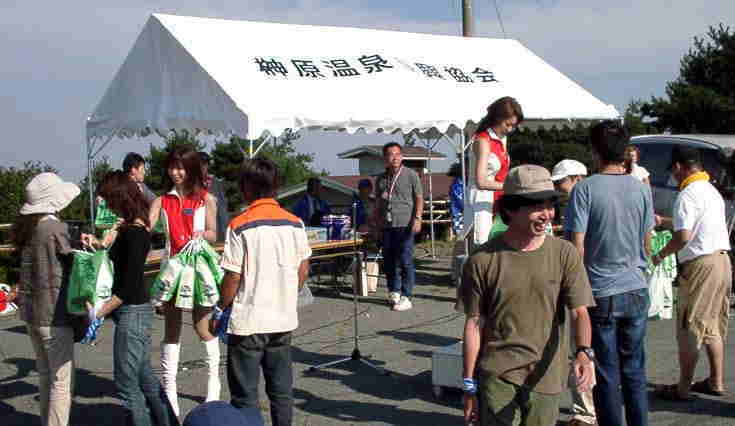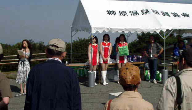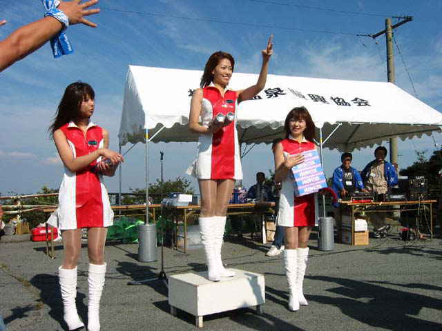 | タイムラリーの表彰が終わったところで、お楽しみの協賛商品争奪じゃんけん大会の開催です。 きれいどころのおねいさんとジャンケンして勝った人が商品を貰える弱肉強食方式。 既に人生に負けている私などは勝てるハズなどありません(泣) |