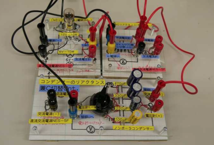 コンデンサーのリアクタンスと電球の明るさ | 60Hz交流電源に容量の異なる4種類のコンデンサーをつなぎ変え,電球に接続して明るさを観察する。電圧と電流の関係からリアクタンスを求める。コンデンサーの容量を変えて,リアクタンスと電気容量の関係を求める。 | |