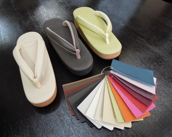 大人気のカフェぞうり。ギアナ(牛革型押し)の色見本からお好きな色でオーダーしていただく定番タイプです。