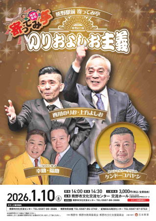 【vol.28熊野駅前寄ってみ亭 のりおよしお主義 熊野公演】 チケット好評発売中 ◇開催日時 令和8年1月10日(土) 開場14:00 開演14:30 ◇会場 熊野市文化交流センター 交流ホール ◇料金3,000円(税込/全席自由) ◇チケット販売所 熊野市文化交流センター 0597-89-3686 熊野市民会館 0597-85-3742 紀和B&G海洋センター 0597-97-0753 ◇お問合せ 熊野市文化交流センター 0597-89-3686