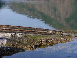 造船場には、船を陸に上げたり、進水するためのレールが、海中まで続く。すぐそばにハモか或いは、アナゴが顔を出していたこともある。潮の満ち干きで、景色が変わる私のお気に入りの場所だ。