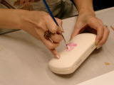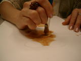 先生が、メガネケースをジャンケンプレ用に用意して下さいました。 カーネーションを描くのよぉ〜♪ 曲面に・・小指をピンと立てて・・ あっという間にカーネーションが咲きました。 |