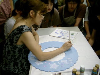 ダブルローディングの作り方、筆の動かし方 一つ一つ丁寧に説明して頂きました。 「先生のを見てると描けそうな気がするんだけどなぁ〜 うまいこといかんわぁ〜」との声が・・ クククククク・・・・σ(^-^)私と一緒のこと思ってる人が居てるわぁ〜 と・・思わずニンマリ・・・ |