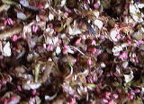 余分な花芽を摘んで人工授粉用の花粉を採取します。左上が豊水の花で花粉採取用に丁度良い開花状態。次が、花から花粉の入っている葯(ヤク・・・花のオシベの先に付いているアズキ状のもの)を取り出す作業行程で使う機会。その右は左の機械で取り出した状態の葯。その右がさらに精選し、ほぼ葯だけの状態。次が開葯器で一定温度で保温中の葯。かすかに葯が破れ、黄色い花粉が見え始めてます。右端葯が破れて出来上がった粗花粉。