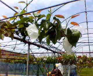 一つ一つ手作業で袋を掛けていきます。当園の規模で全て袋を掛け終わるまで1ヶ月ちょっと。袋をかけることにより、熟すのが若干早くなったり、害虫から果実を守れます。さらには農薬が直接果実に付着するのも防げます。