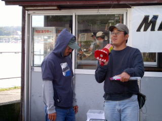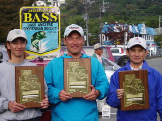 左から第3位 セ○ズリシェイクの分部選手、優勝した12mノーシンカー男の高橋選手、右端がやっぱりイツでもドコでも何でも釣ってしまう三橋選手のトップ3のみなさん