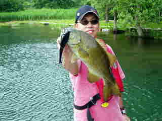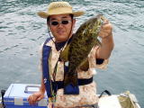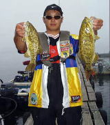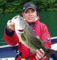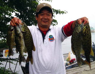 霧が濃くなり始めてベイトが4−5mへ移動・・ 底が見える水深ながらバイトは多い。ここで踏ん張れなければクラシック出場権すら絶望かも・・ そんな後がない状況が 集中力 に火をつけた。反射的にフッキングした2本目のスモールは、バイトを全く感じなかった? あれ?ライトリグでも出来るんだ! そう思った瞬間、天から神が降りて来た(ちょっとアブナイ状態?) 立て続けに3本目、4本目と・・思わず声が出る、「ウッシャ〜! ホラ来たで〜 #%@!」横で見ている編集長には何が何だか「わけワカメ」で、アッという間にリミット達成!