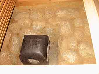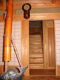 玄関を入ったところ。下には備長炭がびっしり敷き詰めてあるのが見えます。備長炭は、問題になっている「シックハウス症候群」の