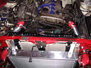 | エンジンの上に付いてる、純正 インタークーラーを、ラジエター前に、 移動!アルミパイピングでつなぎます。 これだけで、パワーアップし、 (加速、最高速アップ)それなのに燃費が、 良くなります。2001.12.1 |
