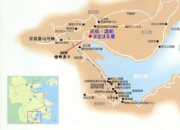 賀田インターを下りて5分ぐらい走ると、突き当たりに信号がある。その信号を左折し、50mぐらい直進し、2本目の筋を右折後50m |