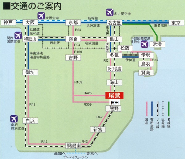 大阪方面から 近鉄特急を利用して「松阪」でJRの特急「南紀」に乗り換え「尾鷲駅」下車、普通に乗り換えて新宮・熊野方面へ4つ目の「賀田駅」で下車 |