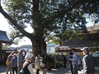 その後、紀北町三浦にある豊浦神社に移動し、三重県天然記念物に指定されている社叢にあるバクチノキ、クスノキなどの巨樹・古木を三重森林インストラクター会の案内で見学をしました。