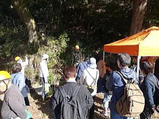 当日は、快晴に恵まれ、8団体の参加者38名がNPO法人居宅支援システム実践のフィールドである「芙蓉苑」に集合し、開会式で県みどり共生推進課長から祝辞を受け、その後、伐採作業と下刈体験を行いました。当初は、間伐体験を行うこととしていましたが、台風21号の風倒被害を受けたため、風倒木の処理に変更しました。掛木となっている木にロープを結び安全に倒す作業など体験しました。伐採木は、近くの「木の駅」に搬出し有効利用を図っています。