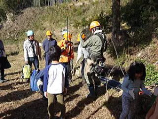 昼食後は、津市美杉町八手俣にある組合所有の森林に移動し、4名の組合職員を講師とし、伐木、かかり木の安全な処理方法について説明、実演があり、その後に、何人かが伐倒、かかり木処理の実習を行いました。